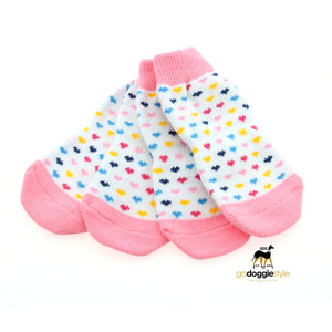 - 100% Cotton Non-Skid Dog Socks - Pink and White Hearts - Protective Dog Socks - XS to XL
