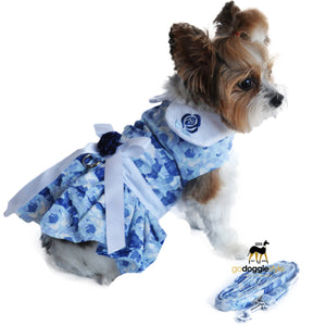 Blue Rose Harness Dress with Matching Leash - Spring Summer Dog Dress - Flower Dog Dress With Bow & Embroidery - XS to XL - 3 to 30 lbs