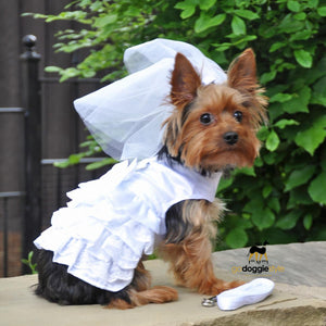 Your little bride will be so beautiful walking down the aisle wearing this elegant white satin and lace Dog Wedding Dress Set.