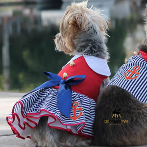 All paws on deck! Pups will feel ready to take on the open seas with our new Nautical Dog Dress and matching Nautical Dog Vest. Both feature anchor and brass button embellishments and include matching leashes, built in D-ring and has heavy duty hook and loop closure for added safety.