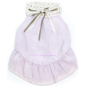 This breathtaking pale pink dress with a soft double-layer skirt features a vintage-inspired hand-crocheted collar, trimmed with a delicate suede and satin ribbon. Hand-sewn pearls and sequins on the beautiful hand-crocheted neckline add a hint of sparkle and sophistication.