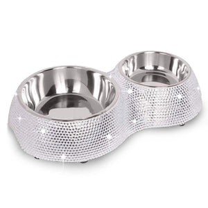 The base of the bowls are adorned with crystals and feature two removable stainless steel bowls. The stainless steel bowls are dishwasher safe and the base is recommended to be hand washed. Perfect for small dog.