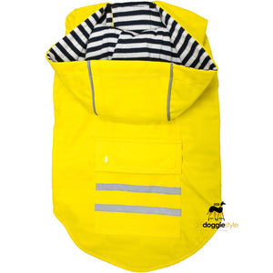 Slicker Dog Raincoat With Striped Fabric Lining & Pocket - Yellow - Heavy Duty Protective Waterproof - Leash Access Hole - Reflective Striping - XS to 3XL
