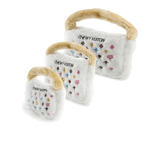 Chewy Vuiton Purse Toy from our collection of designer dog toys by Haute Diggity Dog. This best selling designer dog toy is back in stock! We love this adorable plush dog toy that looks just like your favorite handbag! Chewy Vuiton handbag purse toy is made from soft plush material with a squeaker inside. Your dog will love playing with this cute, fun toy! Imported.